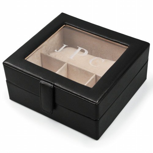 Everything stays neatly in place with this sleek accessory case. four spacious inside compartments black embossed snakeskin exterior clear glass lid tan suede interior lining 8 x 7 x 4inch engraving up to 15 characters for italicized name or choose 3 character block monogram Imported Available in colors: Black. Available from JCPenny.